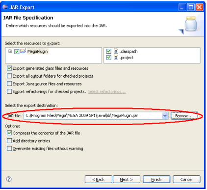 The JAR file must be generated (or copied after generation) in the "java\lib" directory of the MEGA installation site.