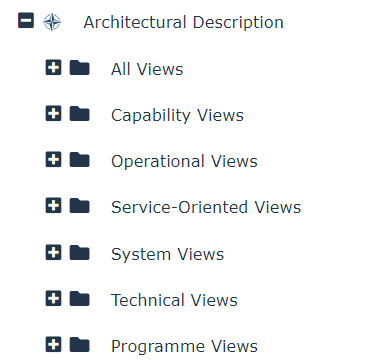 Each architecture displays folders which correspond to one of the seven NAF views: