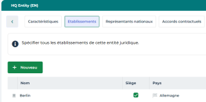 Vous pouvez spécifier le pays sur l'établissement siège de l'entité juridique.