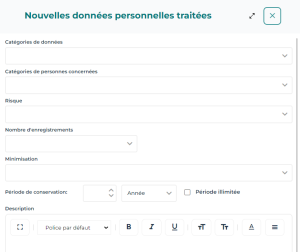 A la création de données à caractère personnel, le niveau de Risque est automatiquement calculé à partir de l'échelle de risque la plus haute spécifiée par l'administrateur fonctionnel dans la section Éléments clés (pour les catégories de données et les catégories de personnes concernées).