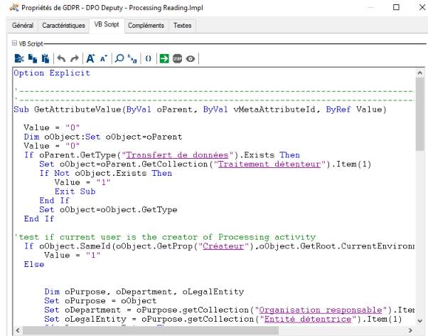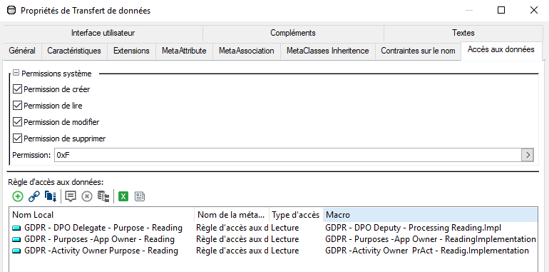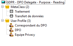 Ex. : la règle "GDRP - DPO Delegate - Purpose - Reading" s'applique aux MetaClasses Traitement et Transfert de données pour les profils Correspondant du DPO, DPO et Equipe Privacy.