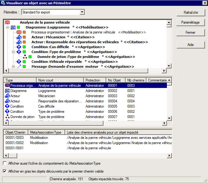 La fenêtre Visualiser un objet avec un Périmètre présente de deux façons l'ensemble des objets exportés (résultat de la propagation appliquée à l'objet racine) :