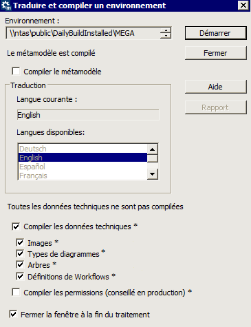 Si les données techniques et le métamodèle ne sont pas compilés, vous devez impérativement conserver aussi la sélection de Compiler le métamodèle*.