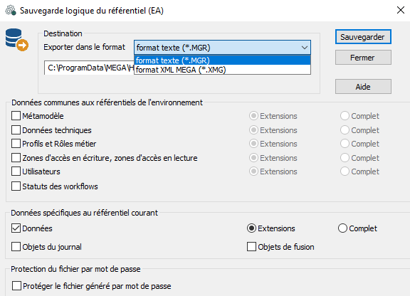 *Pour une sauvegarde logique normale, il suffit d'extraire les Extensions des Données du référentiel.