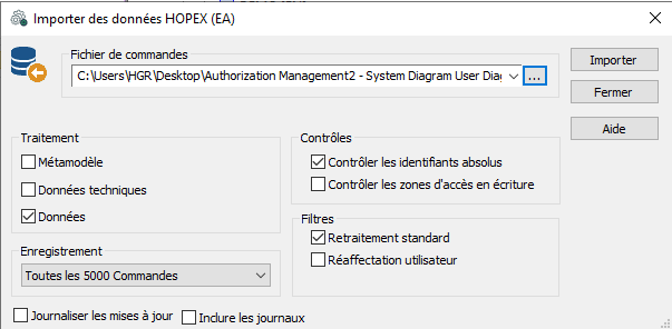 • Contrôler les identifiants absolus n'est pas sélectionné dans le cas d'un fichier de commandes qui ne provient pas d'un référentiel Hopex.