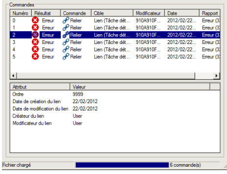 La fenêtre de visualisation du fichier de rapport s'affiche et détaille les Commandes contenues dans le fichier importé ainsi que le Résultat de l'exécution de chaque commande :