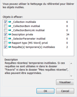 Au cours du travail de modélisation, la manipulation de différents objets donne lieu à la création d'objets temporaires (requêtes temporaires, etc.). Il est probable que ces objets ne seront plus utiles par la suite. Afin d'éviter que la taille d'un référentiel ne devienne trop importante, vous pouvez supprimer ces objets temporaires.
