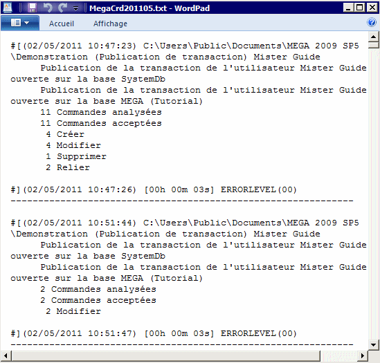 • Error level 2 : des erreurs mineures ont été rencontrées, comme une tentative de création d'objets ou de liens qui sont déjà existants.