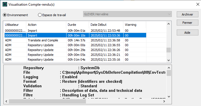 Cette fenêtre permet également de visualiser le fichier de compte-rendu de chacun des utilisateurs de l'environnement. Pour chaque action sont indiqués :