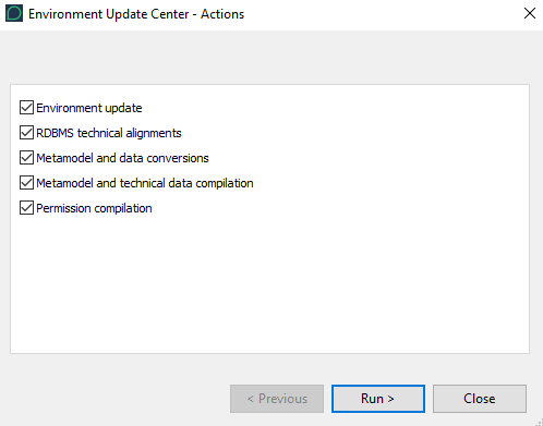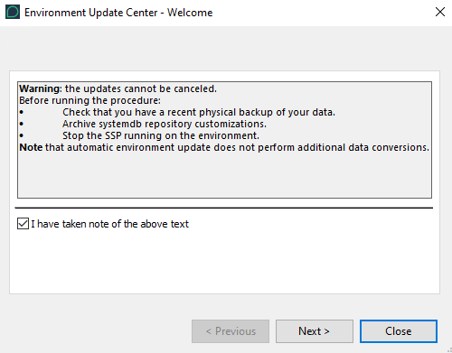 4. Dans la fenêtre Environment Update Center, lisez et validez le Warning.