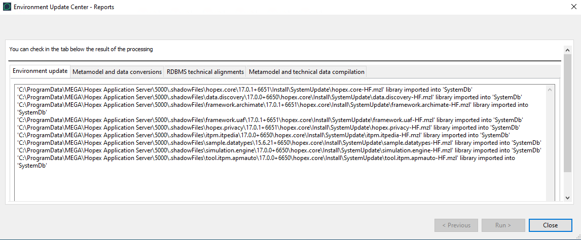 Les rapports des mises à jour s'affichent dans quatre onglets (le dernier cumule les deux étapes de compilation).