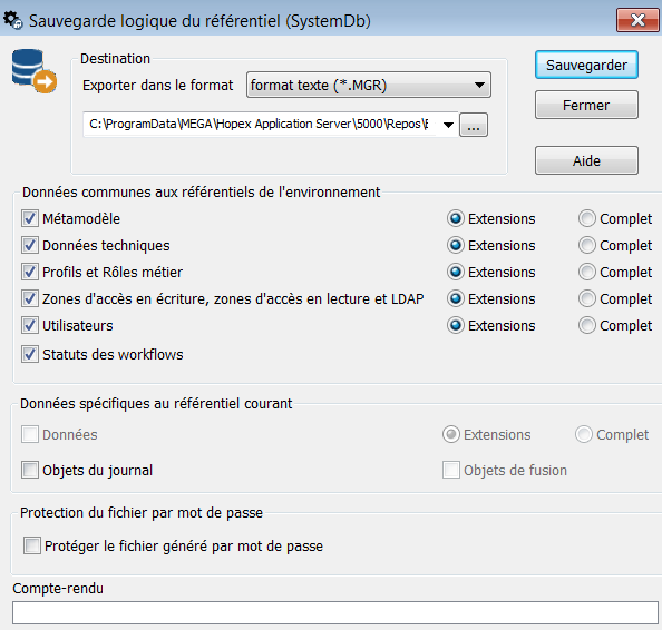 Par défaut, la sauvegarde est enregistrée dans le fichier "SystemDb.mgr" dans le dossier \SysDb\WORK\ du référentiel.