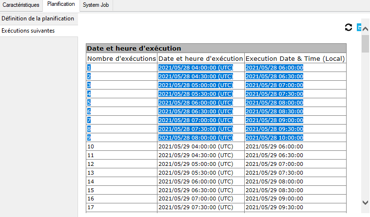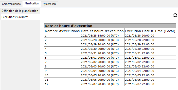 Le tableau Date et heure d'exécution indique la première date et heure d'exécution puis les suivantes et leurs correspondances en heure locale.