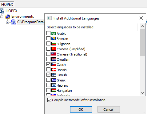 Les langues sélectionnées sont ajoutées à la liste des langues disponibles dans Hopex (dans les options : Installation > Langues).