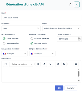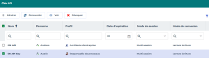 Les clés API sont utilisées pour établir des sessions sécurisées avec Hopex, par exemple lors de l'utilisation de GraphQL, ou dans le cadre d'une intégration avec ServiceNow ou Microsoft Teams.