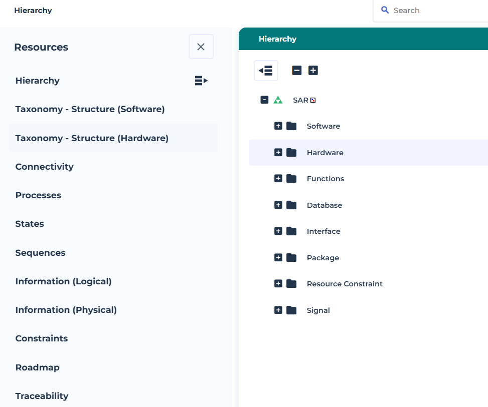 The Hierachy aspect of the Resource view helps UAF Architect to manage a solution architecture consisting of resources: organizational, software, artifacts, capability configuration, natural resources that implement the operational requirements.