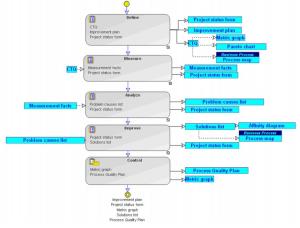 In the example above, the first phase of the method is "Define" and the output deliverables of this phase are "Project Status Form", "Improvement Plan" and "CTQ".