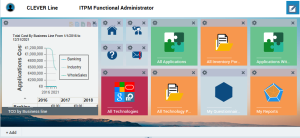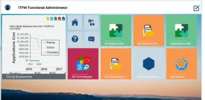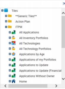 E.g.: the MEGA IT Portfolio Management home page for the functional administrator includes, by default, tiles that provide access to the list of all inventory portfolios as well as the list of repository applications.