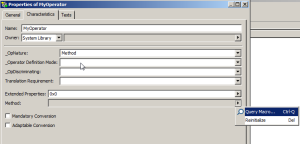 VB Script | The macro must implement the following functions: ‘specify the number of arguments that will be passed to the operator: here 3. Function InvokeArgCount() As Integer InvokeArgCount = 3 End Function ‘Method called when the operator is called with 3 arguments. The first argument is the object on which the call is made (megaobject). Sub InvokeOnObject(Obj as MegaObject, sFileName As String, strReportFilename as String , controlComponent As MegaObject) End Sub |
