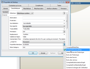 When the "Fields" context is activated, the VB script is pre-interpreted so that its fields can be replaced by expressions compatible with VB Script syntax. MetaClasses, MetaAttributes and MetaAssociationEnds can then be pasted in the script in the form of fields rather than the corresponding object names.