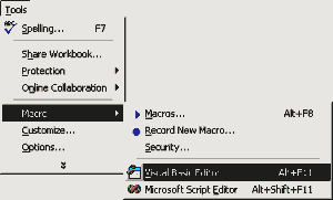 1. From Excel menu bar, select Tools > Macro > Visual Basic Editor.