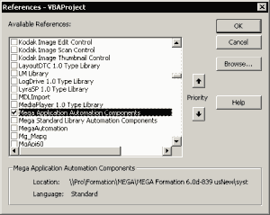 2. In the VBAProject References dialog box, select the Mega Application Automation Components component.