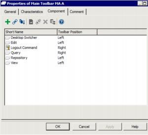 7. By default, the toolbar components are aligned left in the toolbar; to align a component on the right, click in the Toolbar Position field of the MetaCommand Group, MetaCommand Item or Parameterized Tool, and select Right (example: disconnection command "Logout Command").