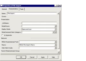 12. Open the Properties dialog box of the command you have just created (example: "File Import").