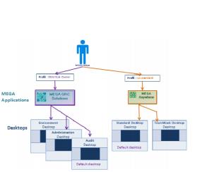 A user can connect to one or several desktops depending on his/her profile and authorizations. The user passes from one desktop to another by logoff/login or by using the MEGA Tool Desktop Switcher.