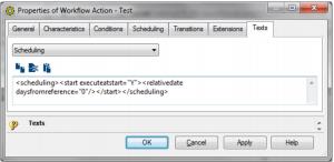The MetaAttribute “Scheduling” is added on “Workflow Action” MetaClass. A MetaPropertyPage is added on “Workflow Action” MetaClass, this MetaPropertyPage includes a platform provided scheduling propertypage using this syntax: