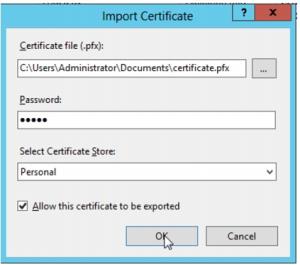 7. Select the certificate. Provide a password if necessary, and click « OK » to import the certificate :