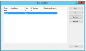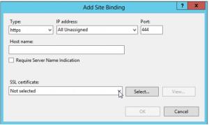 10. Add a new binding, for HTTPS, on a specific port (in this example, as the port 443 is already used, we will choose 444). Use the default port 443 whenever possible, as it permits you quite easily to make the URL of the website user-friendly :