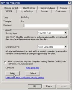 4. Change the “Security Layer” option to “SSL (TLS 1.0)”. Be aware that you will need to have a specific certificate installed on your server to switch to that level. The “Select” button allows you to browse your installe certificates and choose the proper one: