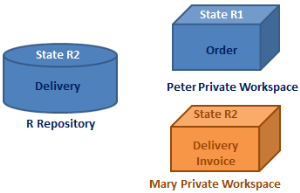• Mary opens a new private workspace, her repository view is state "n+1" (R2).