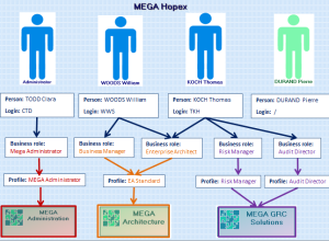 • Thomas KOCH has a login connected to business roles Enterprise Architect (connected to EA Standard profile), Risk Manager (connected to ERM Risk Manager profile) and Audit Director (connected to Audit Director profile):