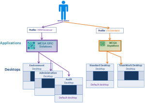 - to the application "MEGA GRC Solutions" which contains desktops "Audit", "Environment" and "Administration".