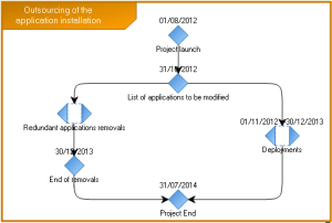 The above example presents a timeline for the upgrade of application assets. Phases of deletion of obsolete applications are synchronized with phases of deployment of new applications.
