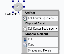 In a resource architecture diagram, the pop-up menu of an architecture element (for example a physical asset) presents commands specific to the object type deployed for the element (artifact), followed by the commands relating to the physical asset itself. The third pop-up menu level concerns graphics.