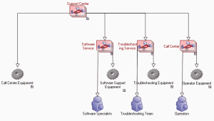 In the example of the support center, the resource architecture diagram presents equipment of the center and the resource architectures that enable request processing. Each of these architectures is itself comprises an org-unit and an equipment architecture.
