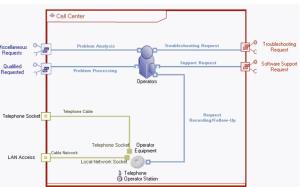 The resource architecture diagram of a call center describes the equipment and organizational resources required for handling service requests.