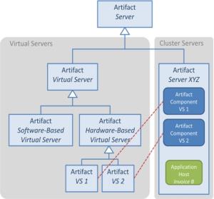 Finally, it is possible to have configuration including virtual items and clusters. For example, one can create a cluster of virtual servers … or some virtual cluster of servers! Based on the proposed approach there is no problem to design both these combinations. Virtual servers are simply grouped in a cluster server and in a physical server. The reusability of the artifacts is powerful in this context and it is not mandatory that the virtual and cluster group contains the same items.