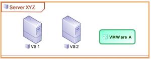 In the example above, two servers are available for the end user: VS 1 and VS 2. They are both virtual servers hosting business application (e.g. Invoice). The infrastructure supporting the end-user servers is composed of a physical server Server XYZ that generates the virtual server and hosts an instance of the VMWare application. The implementation of such design in the MEGA 2009 SP3 Release is based on the Artifact Assembly Diagrams. These diagrams are very simple from a graphical representation perspective and look like the following: