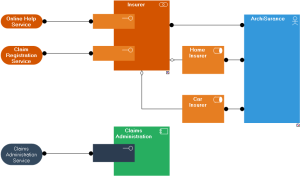The "Claim Registration Service" is available on the company portal. The Business service is assigned to an Application Interface noted "Insurance web services". This interface is used by the "Claim administration" application component and the corresponding application service is noted "Claim administration service".