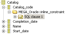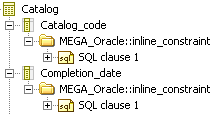 It is possible to modify standard behavior by defining an automatic naming rule for an SQL clause type. This configuration is carried out at the clause type _settings property level. In the example below, the configuration on clause type "range_PARTITION" for Oracle 9i indicates that the name of SQL clauses of this type will be built from the value of the PARTITION property.