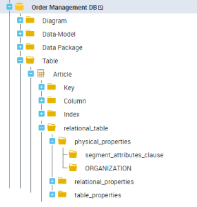 The physical data navigation pane allows you to complete database physical modeling by specifying parameters specific to each DBMS and therefore to produce complete SQL scripts.