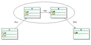Therefore in the following example, if you merge tables A and B and keep the primary key of table A, the primary key of B disappears at merge. Nor is foreign key FKab transferred since it references primary key B. The other foreign keys, FKca and FKbd, are transferred in the relational diagram.