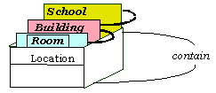 A classroom is contained in a building, which is contained in a school.