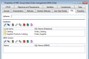 SQL options available in an entity properties dialog box concern synchronization, which enables translation of a data model expressed in entity/association formalism to a logical model expressed in relational formalism. See