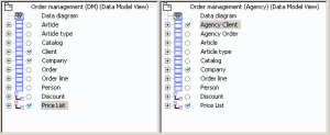 Different modeling levels can cover distinct requirements. Take the example of two data models. A business function data model "Order Management (DM)" is at conceptual level. It describes at business function level how orders should be managed.