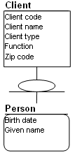 In the above example, attributes are interesting on persons that are of no avail for other categories of clients. Person is a dependent entity represented by a rounded corner box.